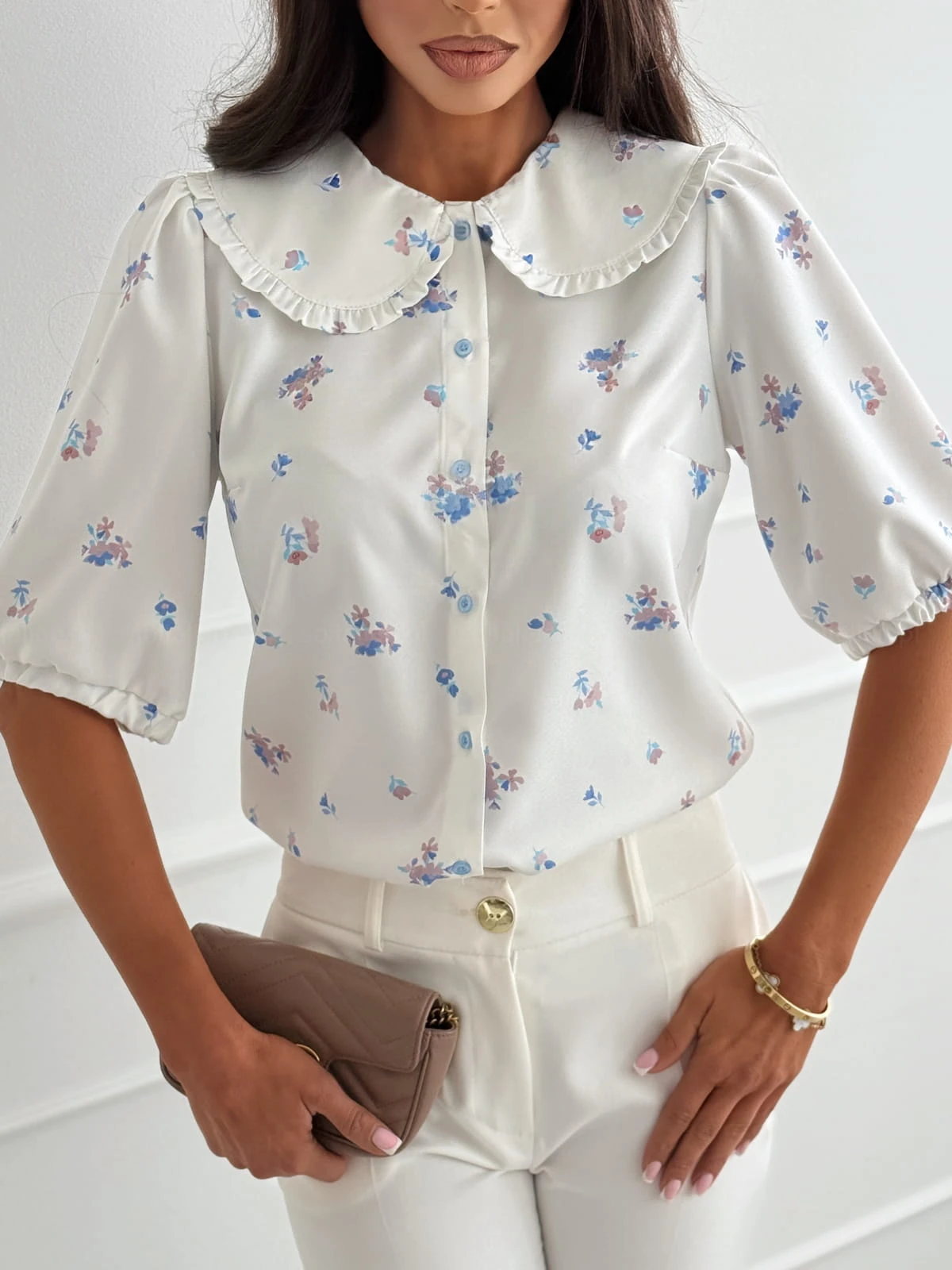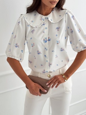 Bluzka koszulowa STELLA white&flowers z kołnierzykiem