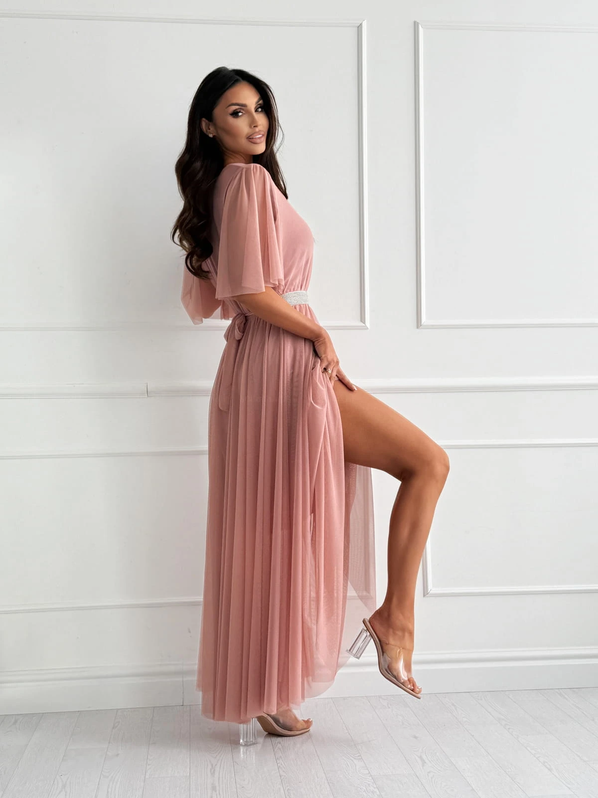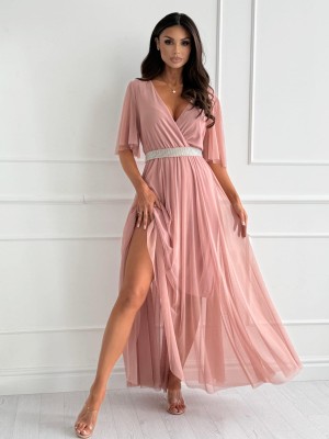 Sukienka DAZZLING MAXI powder pink z paskiem