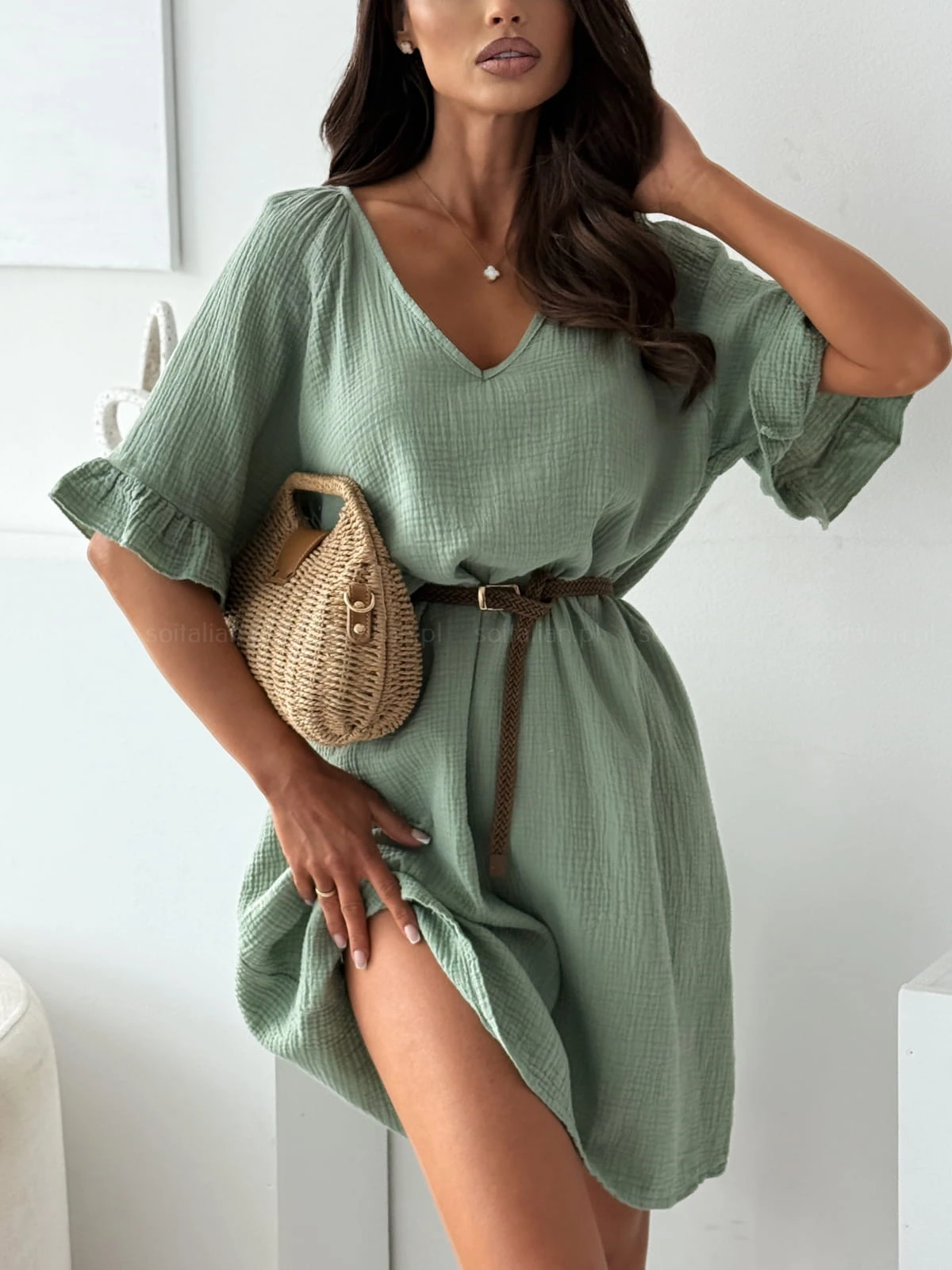 Sukienka muślinowa MONACO KHAKI z paskiem
