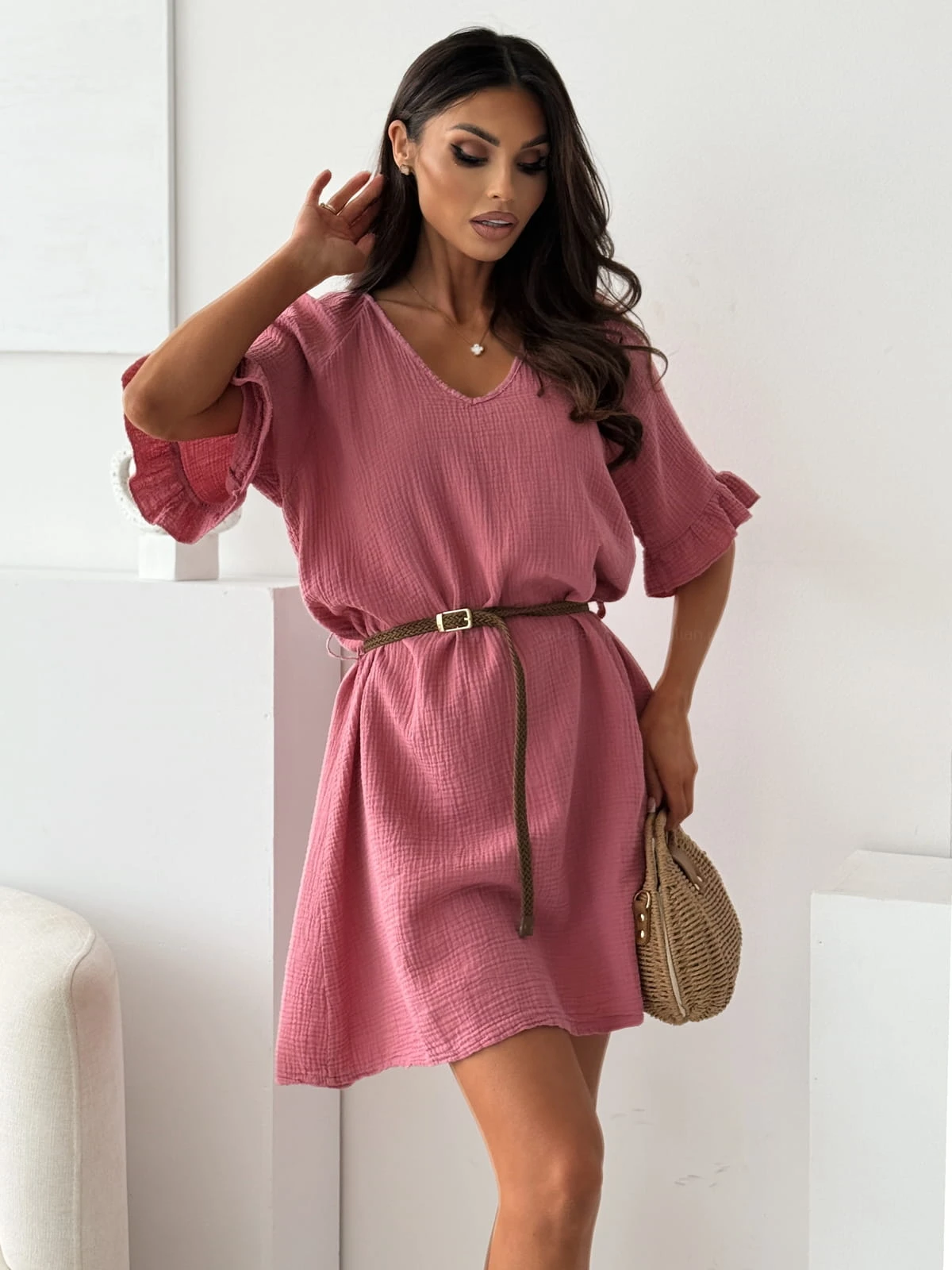 Sukienka muślinowa MONACO PINK z paskiem