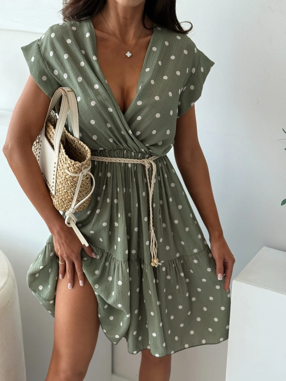 Sukienka w groszki VILAMOS khaki z paskiem