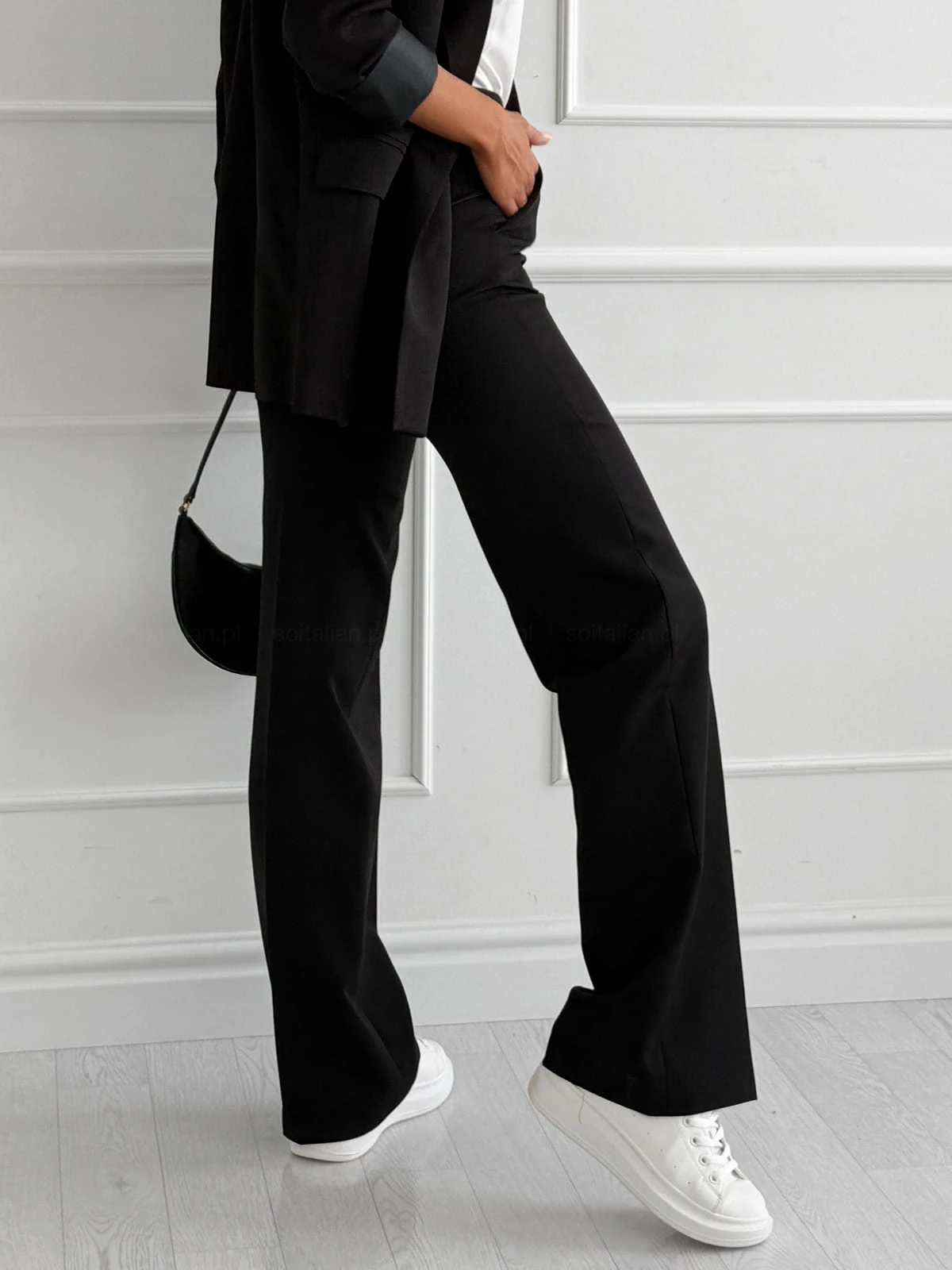 Eleganckie spodnie z elastyczną gumką w pasie, w kolorze czerni o klasycznym kroju z szeroką nogawką. Wysoki stan pięknie podkreśla talię, a minimalistyczny design sprawia, że sprawdzą się zarówno w biurze, jak i w stylizacjach wieczorowych. Pasują do marynarek CASTELLO i LUXILY