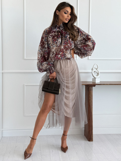 Elegancka bluzka damska o luźnym kroju z kwiatowym printem w odcieniach burgundu, beżu i granatu. Wykonana z lekkiego, zwiewnego materiału, posiada długie bufiaste rękawy zakończone marszczeniem oraz ozdobne wiązanie przy dekolcie.